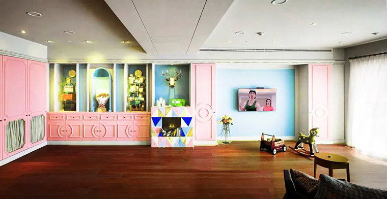 甜美的粉色櫥柜與相鄰的明亮藍(lán)色電視背景墻形成了美妙的色彩沖突,這是一個(gè)年輕的色調(diào)搭配,也是一種情感色彩的組合,感覺就像一個(gè)快樂的擁抱,木地板被用于整個(gè)室內(nèi),建立額外的紋理感。