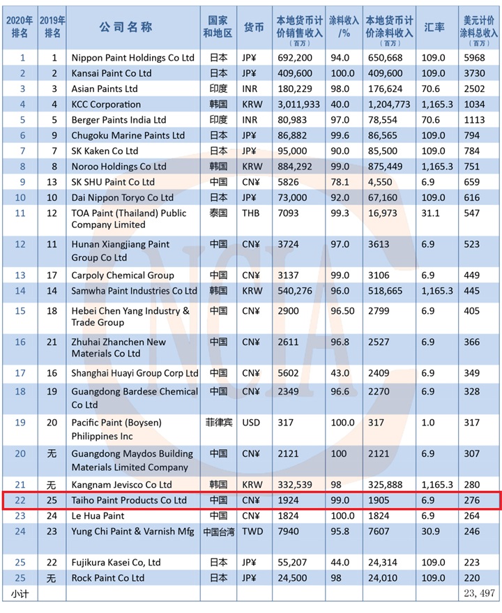 亞太地區涂料企業排行榜是由《亞太涂料雜志》每年頒布一次,今年是該雜志第十二年對亞太地區涂料企業進行評比。其作為全球唯一涵蓋亞太涂料市場的雙月刊,專門報道亞太地區(由印度至澳大利亞)的涂料行業資訊,是全球化工業界高層普遍公認的涂料行業權威的刊物之一。