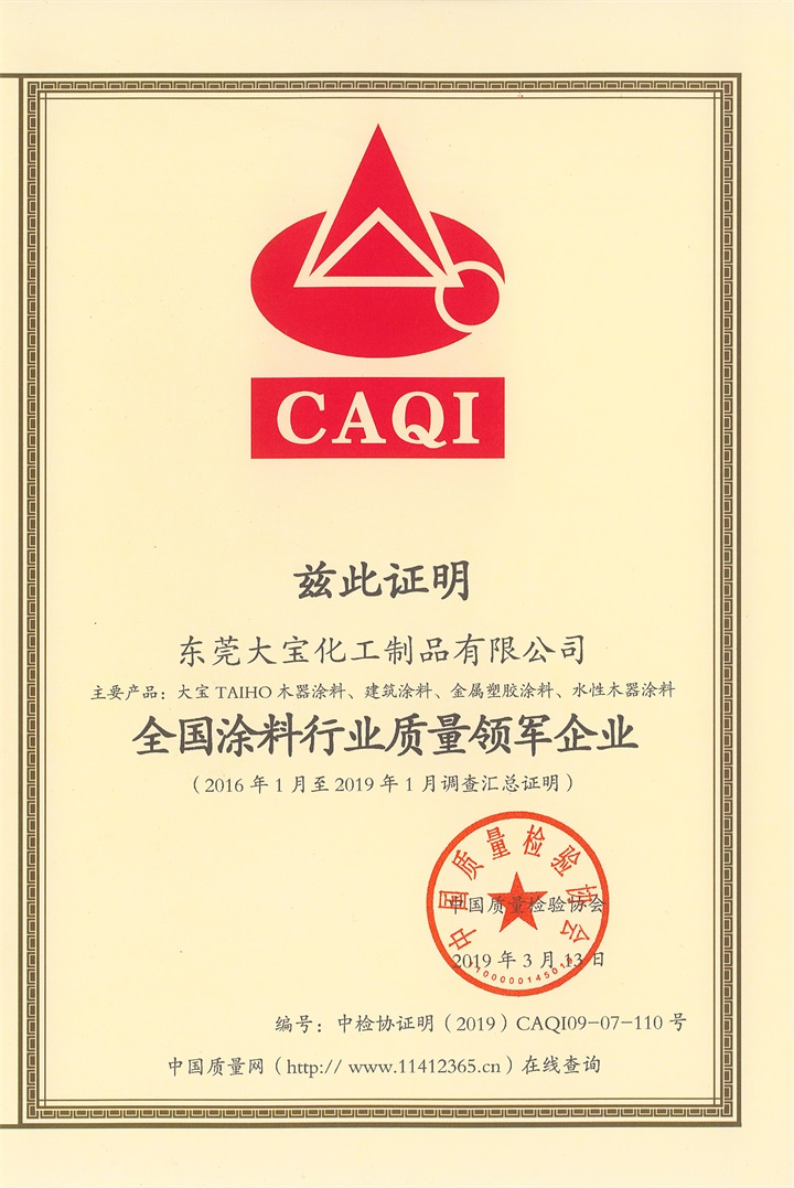 中國質檢協會通過頒發“全國涂料行業質量領軍企業”和“全國質量檢驗穩定合格產品”證書,旨在表彰安全生產、質量管理體系健全、售后服務制度完善、有社會責任感、講誠信重質量并在行業具有廣泛代表性的優秀企業。作為國家高新技術企業,大寶漆不論是在產品質量上,還是在品牌服務、涂裝體驗都走在了行業的前列。