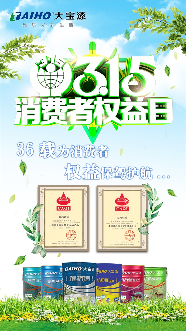 引導質量消費,建設質量強國。日前,從國家質檢總局主管的中國質量檢驗協會傳來喜訊,在中檢協舉辦的2019年“3.15”國際消費者權益日活動中開展“產品和服務質量誠信承諾”主題活動中,大寶漆憑借過硬的質量榮獲“全國涂料行業質量領軍企業”和“全國質量檢驗穩定合格產品”殊榮。