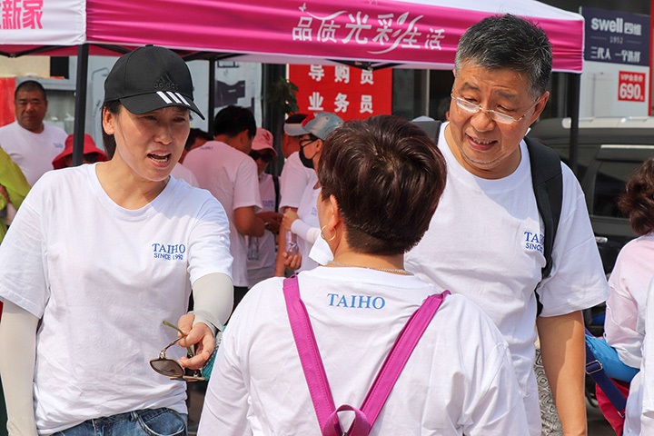 在工作人員的指引下,參賽隊伍高舉印有“大寶漆,品質光彩生活”的旗幟徐徐前進,形成一道道亮麗的風景線。長長的隊伍從起點出發,沿途,大寶漆工作人員為參賽者準備了飲用水補給,運動愛好者們一路走走拍拍,用腳步和汗水感受運動的樂趣。