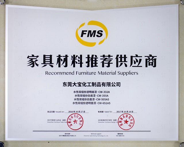 10月28日,2016深圳家具行業(yè)協(xié)會第八屆理事會第一次會員大會舉行。會上,由深圳市家具行業(yè)協(xié)會、深圳家具研究開發(fā)院聯(lián)合發(fā)起的“家具材料推薦供應(yīng)商”證書頒發(fā)儀式同期進行。大寶漆憑借嚴苛的品質(zhì)把控、綠色環(huán)保的涂料產(chǎn)品,獲得本年度原材料企業(yè)“推薦供應(yīng)商”的榮譽。