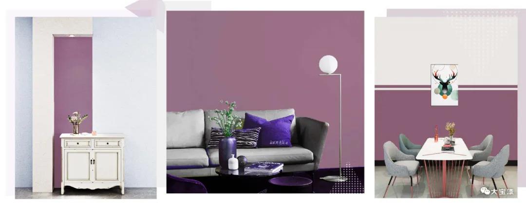 黑加侖紫是一種色澤比較濃郁又帶有粉調的紫色,可以將紫色的高雅與粉色的溫柔融合得很完美。黑加侖紫是安靜而浪漫的,深沉而前衛,帶有一種復古而優雅的氛圍。雖然在家居應用中并不常見,且在室內空間內,大面積使用黑加侖紫其實不大好把控,需要把握好搭配色調和整體比例,可以通過強烈的色彩碰撞帶來驚艷的效果,它也可以搭配高檔中性的灰色、米黃色、黃色等色彩,適度增強空間的亮度。